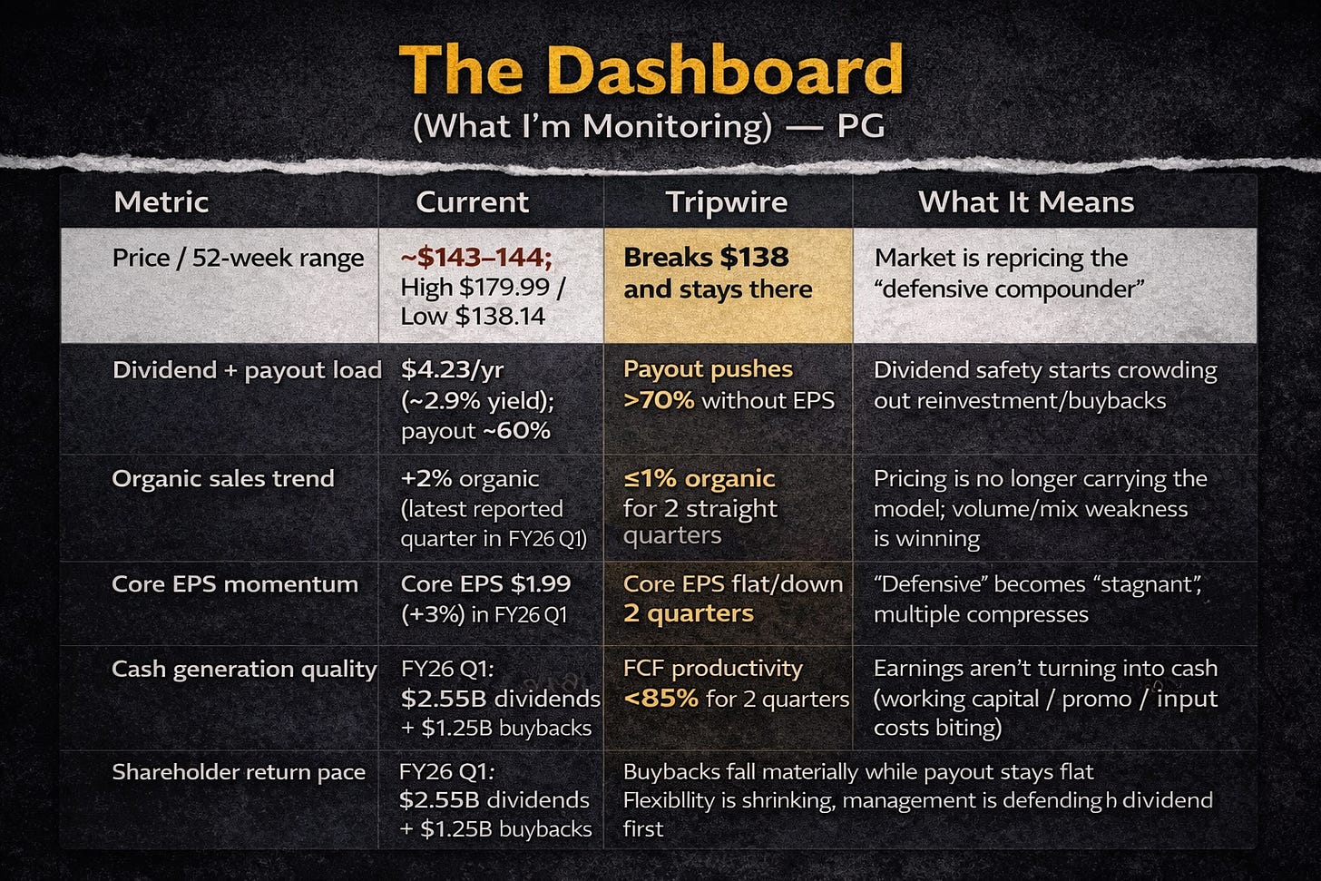 PG doesn’t trade on beats. It trades on volume trends and dividend safety.
